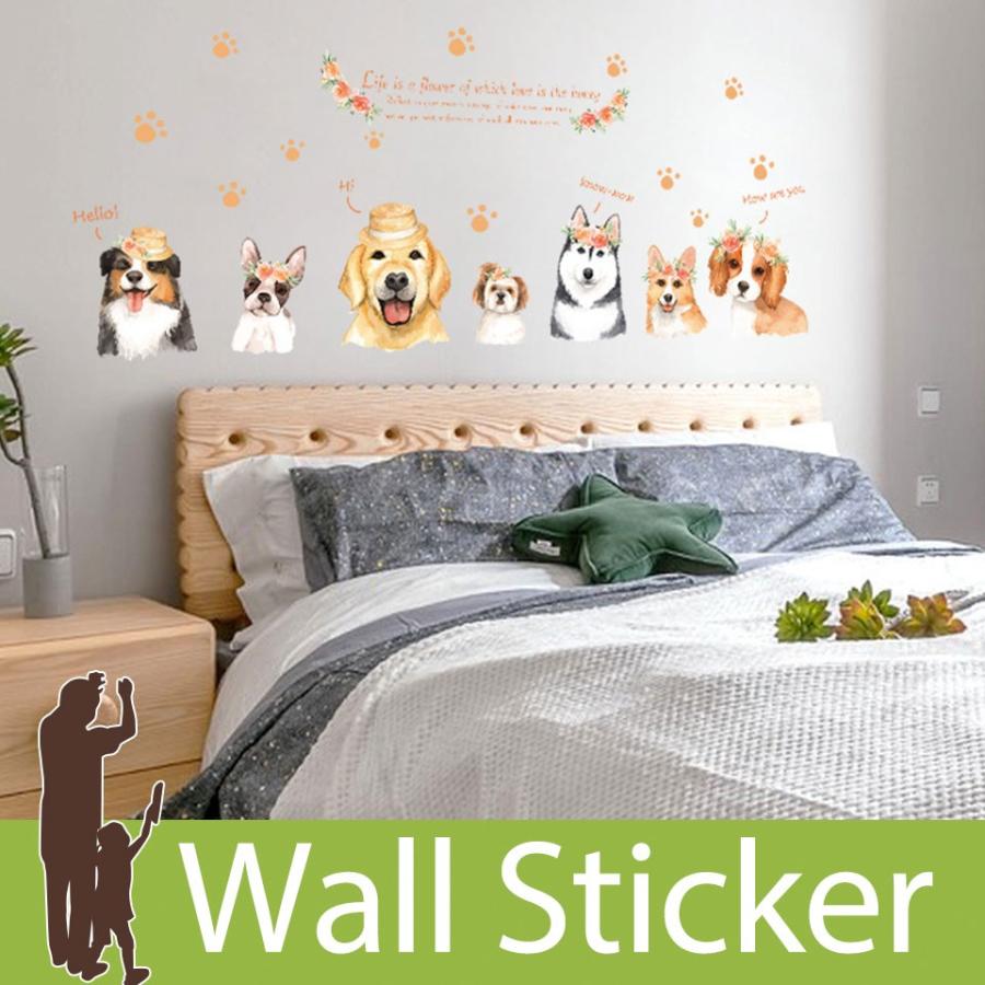 ウォールステッカー 犬 いぬ ドッグ 花 肉球 あしあと 英字 英文 英語 花冠 帽子 お花と7匹の犬 貼ってはがせる 北欧 インテリアシール Wch 310 ウォールステッカー本舗 通販 Yahoo ショッピング
